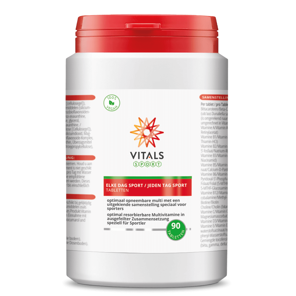Elke Dag Sport heeft exact dezelfde samenstelling als Elke Dag Tabletten, de meest populaire multi van Vitals. Het enige verschil is de naam en dat elke batch van Elke Dag Sport volgens het NZVT-systeem wordt gecontroleerd op doping en gecertificeerd wordt.